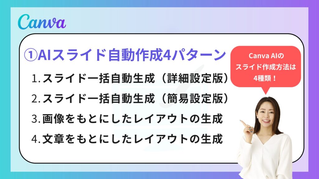 Canva AIを使ったスライド作成には、4パターンの方法があります。