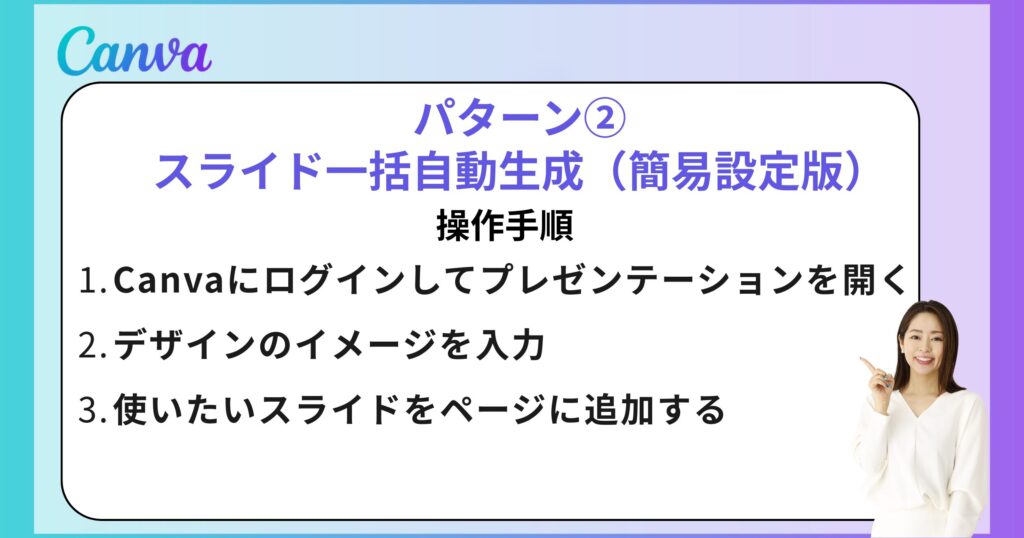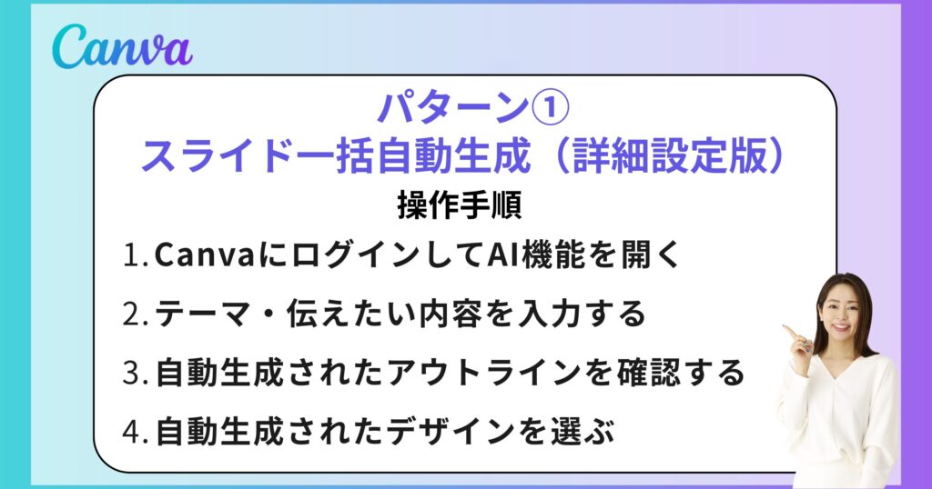 この章では、詳細な設定をCanva AIに伝えてスライドを一括生成する方法をご紹介します。