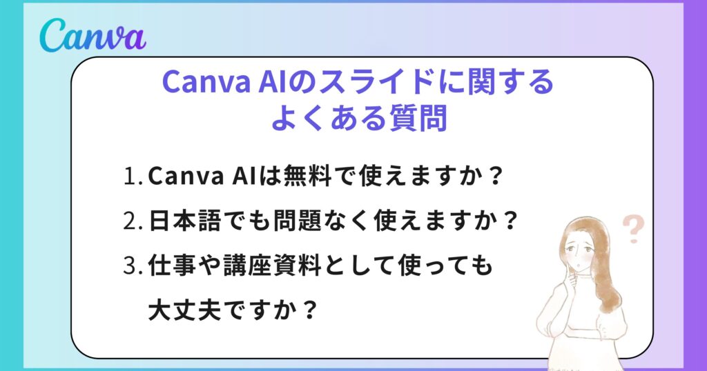 Canva AIは、スライド作成のスピードを大きく高めてくれる一方で、「どう使い分けるか」「どこまでAIに任せるか」によって、成果物の質に差が出やすい機能でもあります。