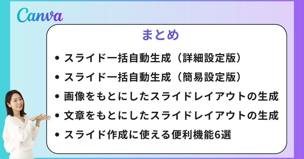 ここまでCanva AIを活用したスライド作成についてご紹介してきましたが、