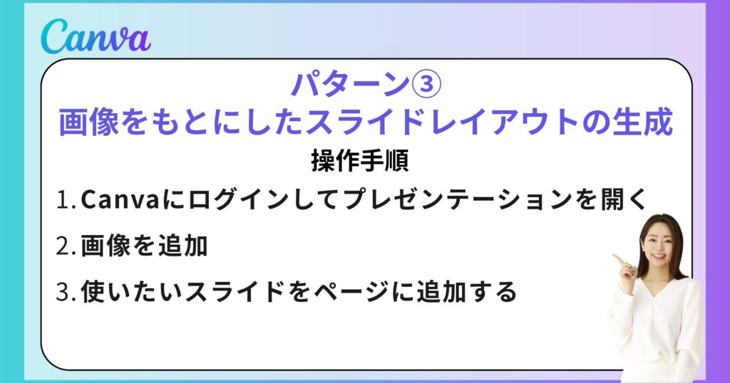 | パターン③ 画像をもとにしたスライドレイアウトの生成 | レイアウト・デザイン | ・デザイン性よりレイアウト案が欲しい ・画像がすでにある |