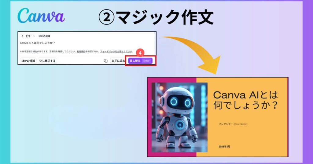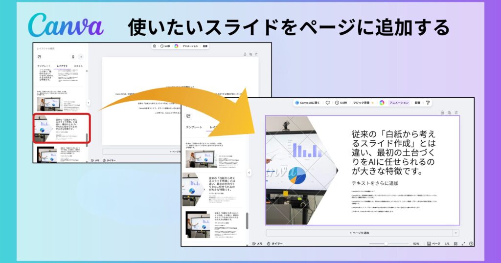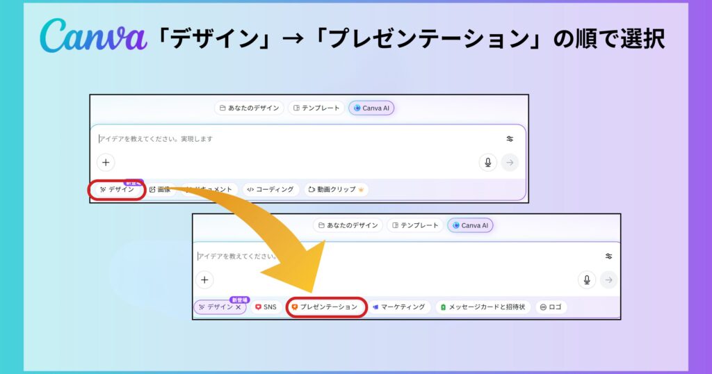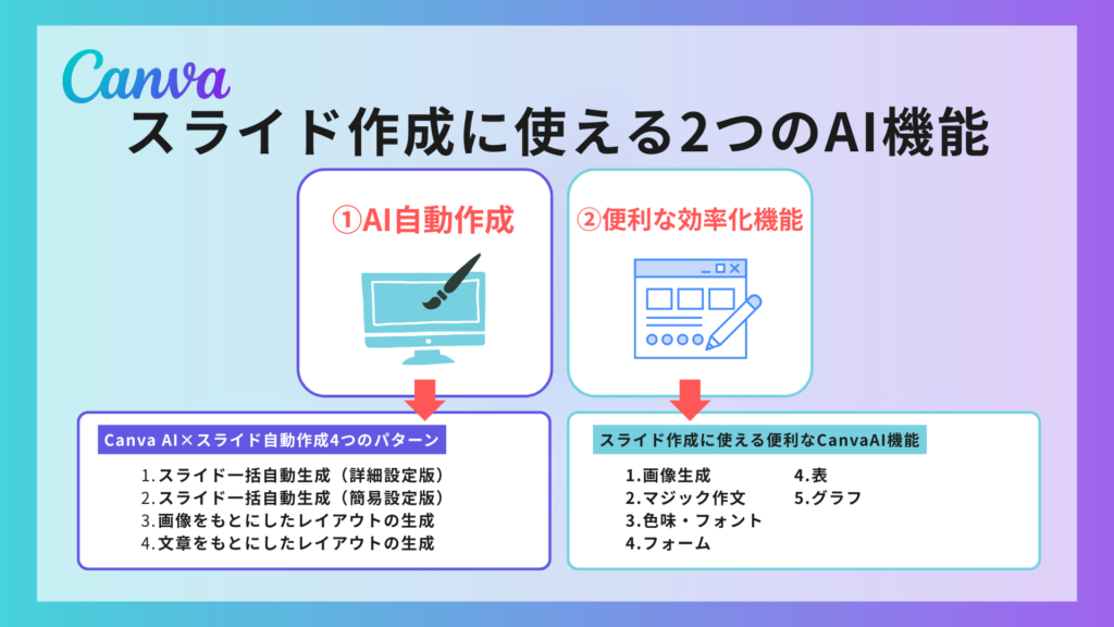 まず、スライド作成におけるCanva AIの使い方は、大きく次の2つに分けられます。