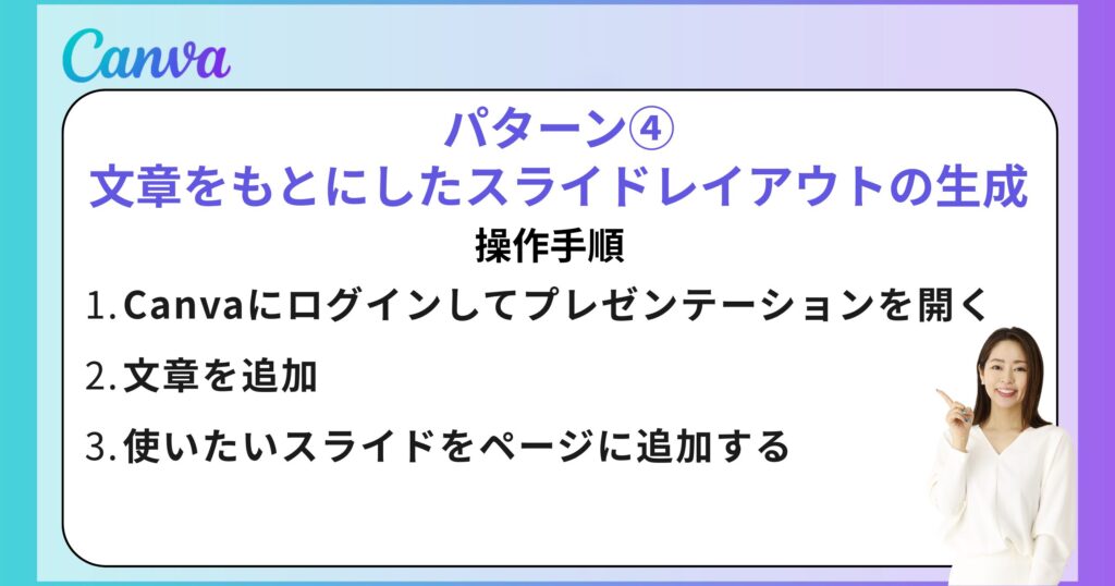 | パターン④ 文章をもとにしたスライドレイアウトの生成 | レイアウト・デザイン | ・原稿や文章がすでにある |