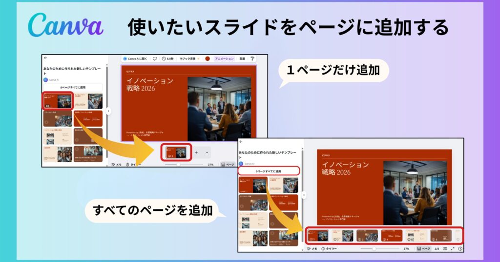目的に応じて、1ページだけ、もしくはすべてのスライドを追加することが可能です