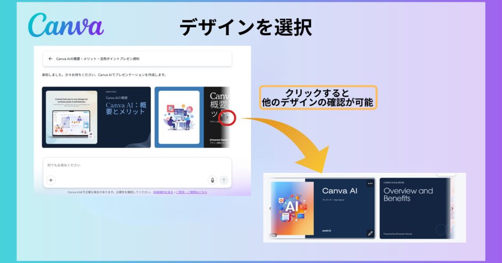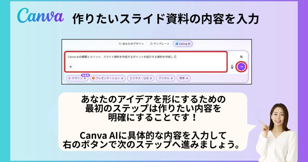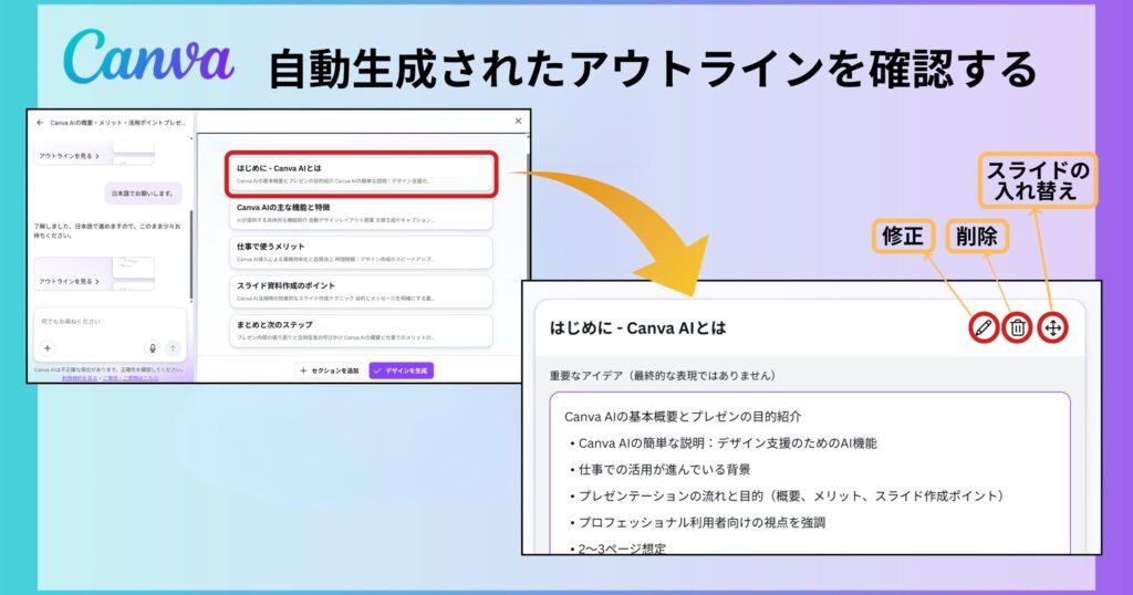 ※今回は「Canva AIの概要とメリット、スライド資料を作成するポイントを紹介する資料を作成して」と入力