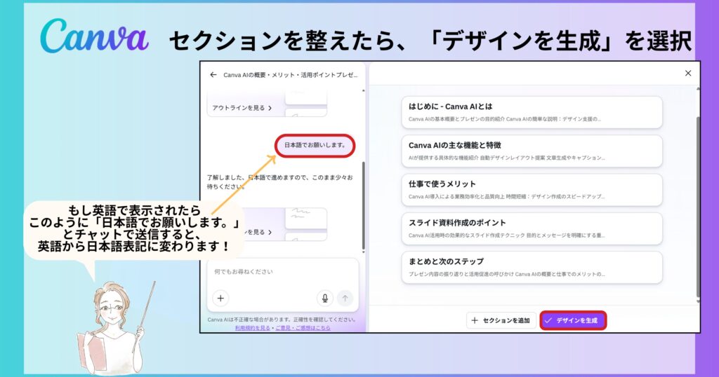 はい、Canva AIは日本語のプロンプトにも対応しています。ただし、たまに英語表記になることがあるので、その場合はチャットで「日本語でお願い」と送信すれば日本語表記で返してくれます。
