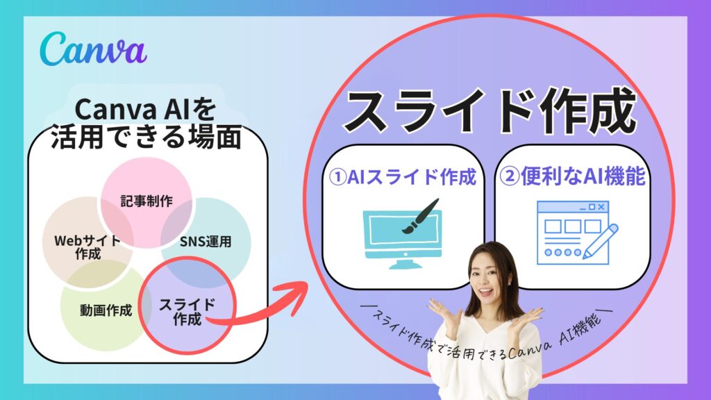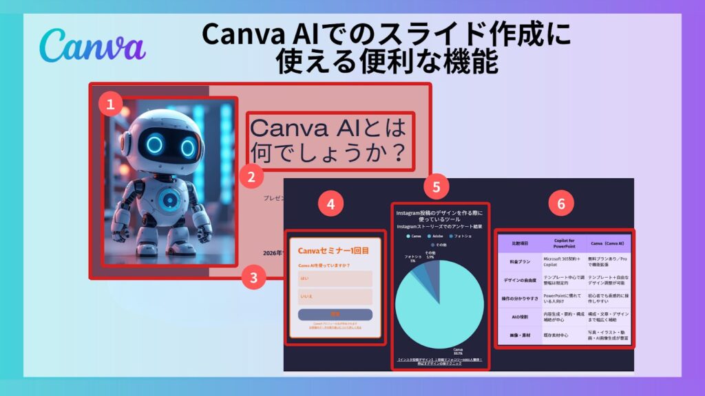 あらかじめ、スライド作成に使えるCanva AIの全体像を知っておくことで、遠回りせず、自分に合った作り方を選べるようになりますよ。