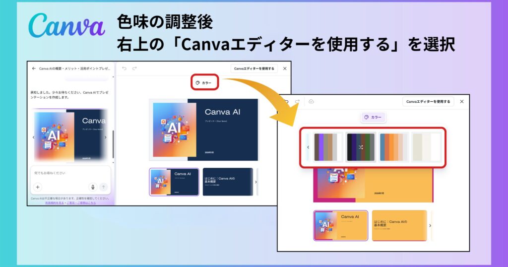 色味の調整が終わったら、右上の「Canvaエディターを使用する」を選択します