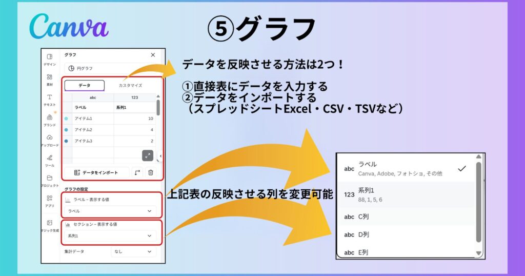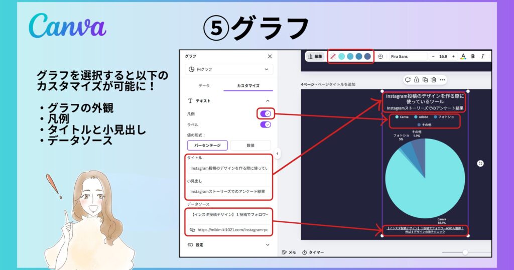 Canvaでは、数値を入力するだけで棒グラフ・円グラフ・折れ線グラフなどを簡単に作成できます。