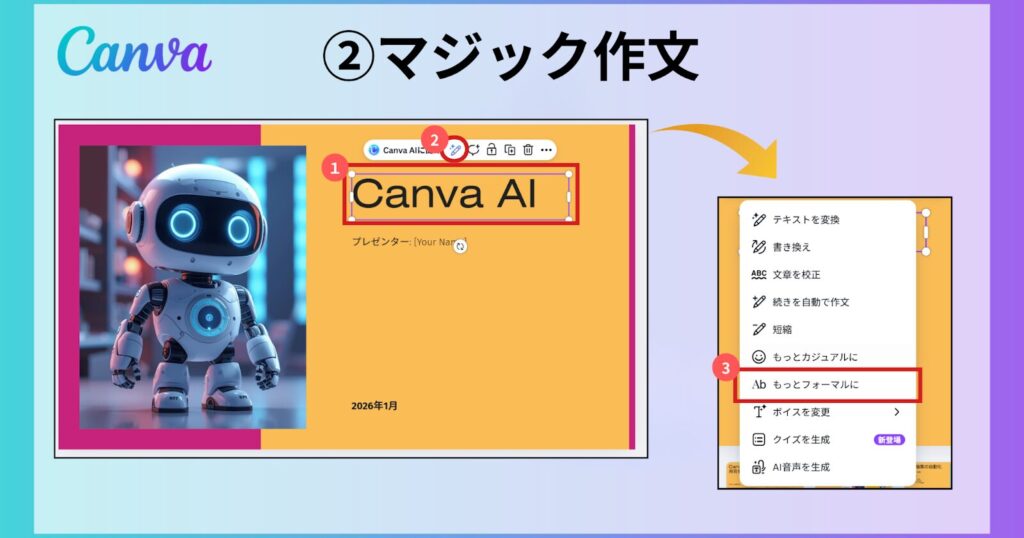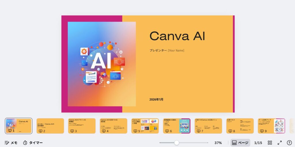 今回は、Canva AIを使ったスライド作成について解説しました。