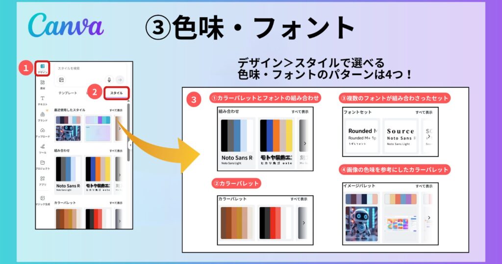 Canvaには配色の提案や豊富な日本語フォントが用意されています。