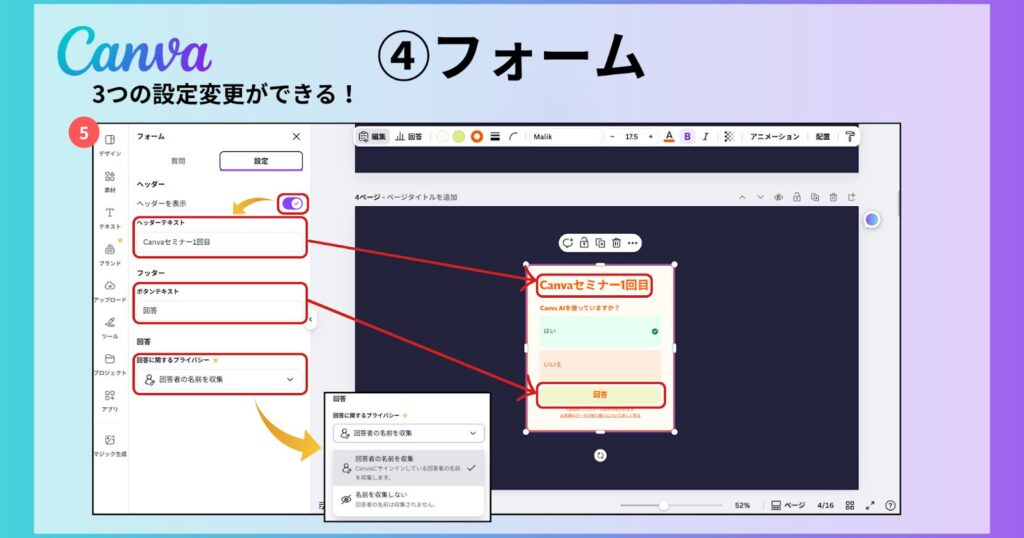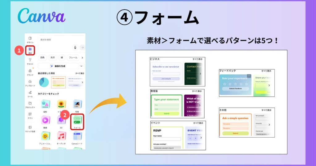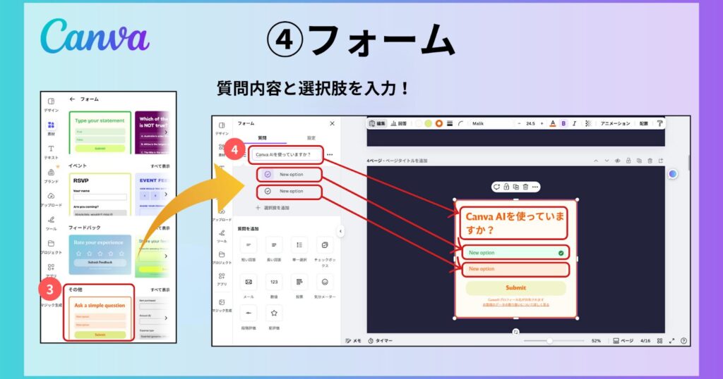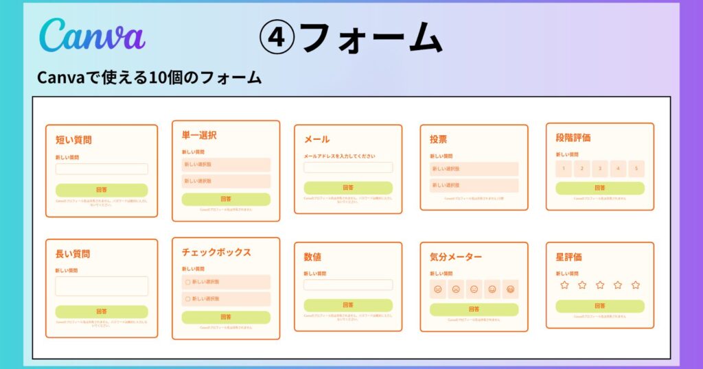 Canvaでは、フォームを作成してスライドや資料に組み込むことができます。