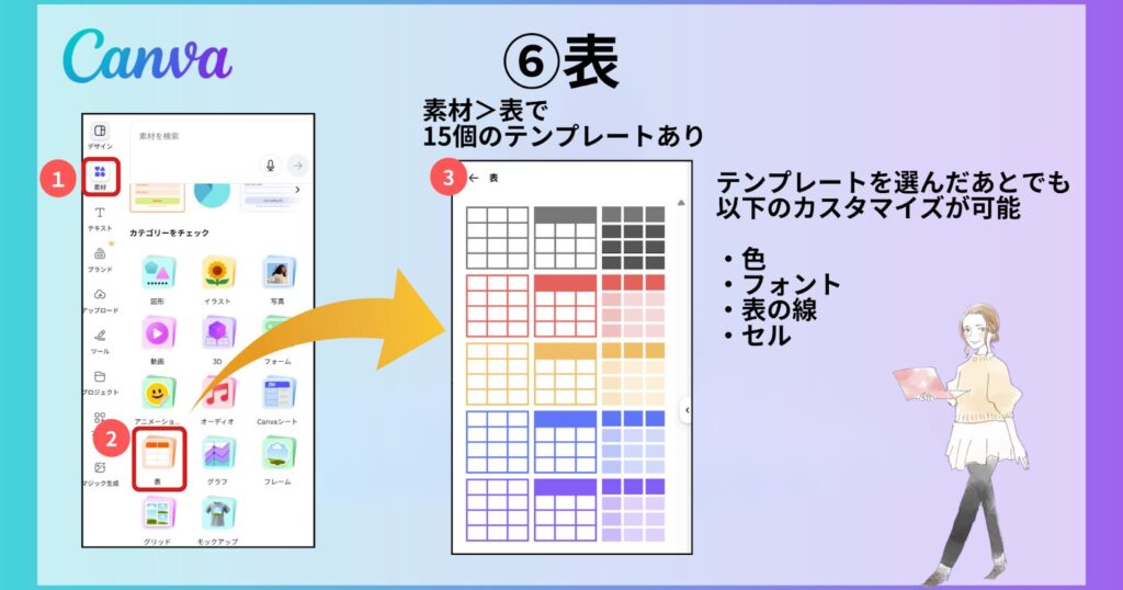 Canvaでは、スライド内に表を挿入して、複数の情報を整理して表示できます。