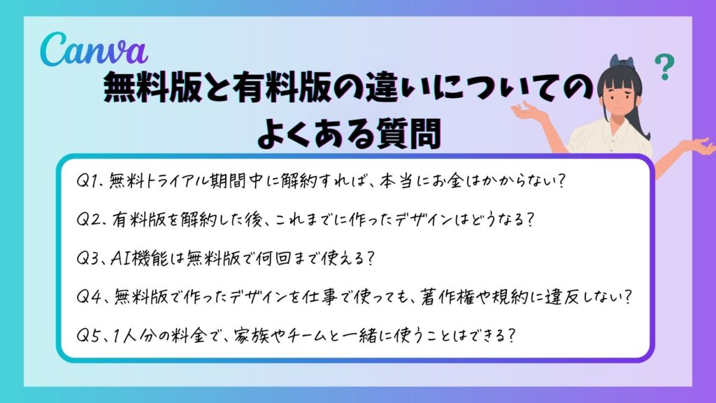 Canvaを使い始める際や、有料版への移行を検討する際に多くのユーザーが抱く疑問を、5つのQ&A形式でまとめました。