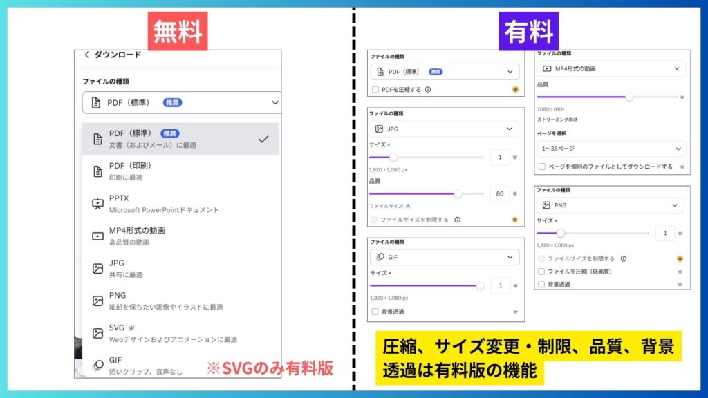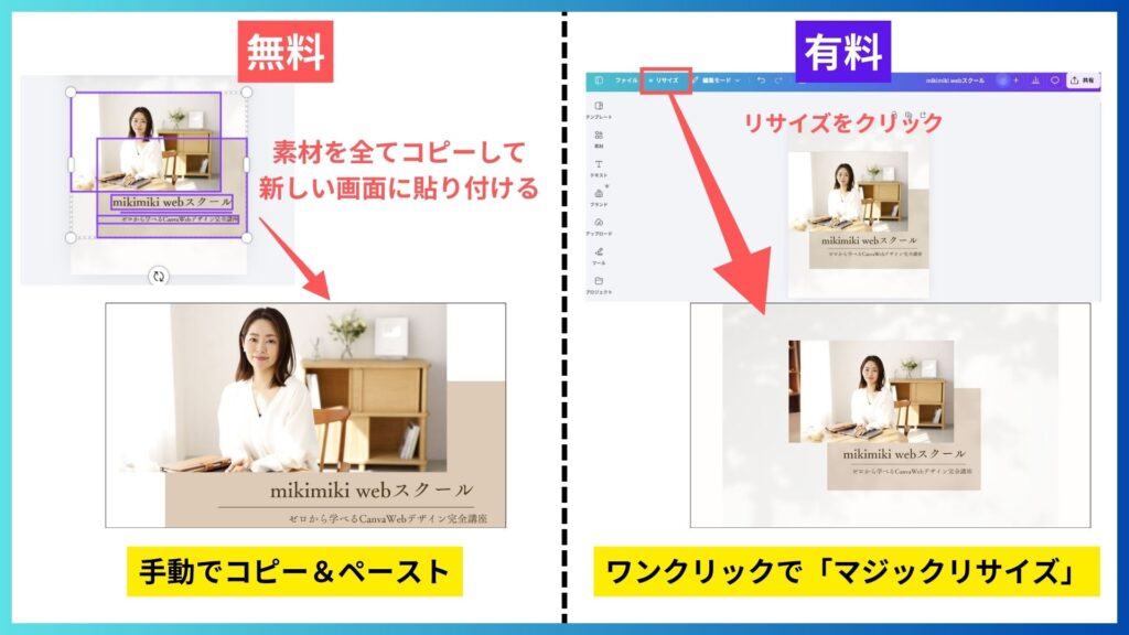Canvaの無料版・有料版ではデザイン完成後の「サイズ変更」の方法に違いがあります。