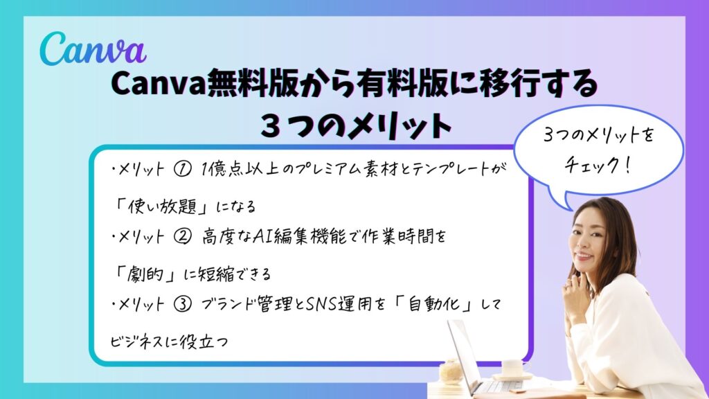 次に、Canva無料版から有料版に移行する3つのメリットについて解説します。