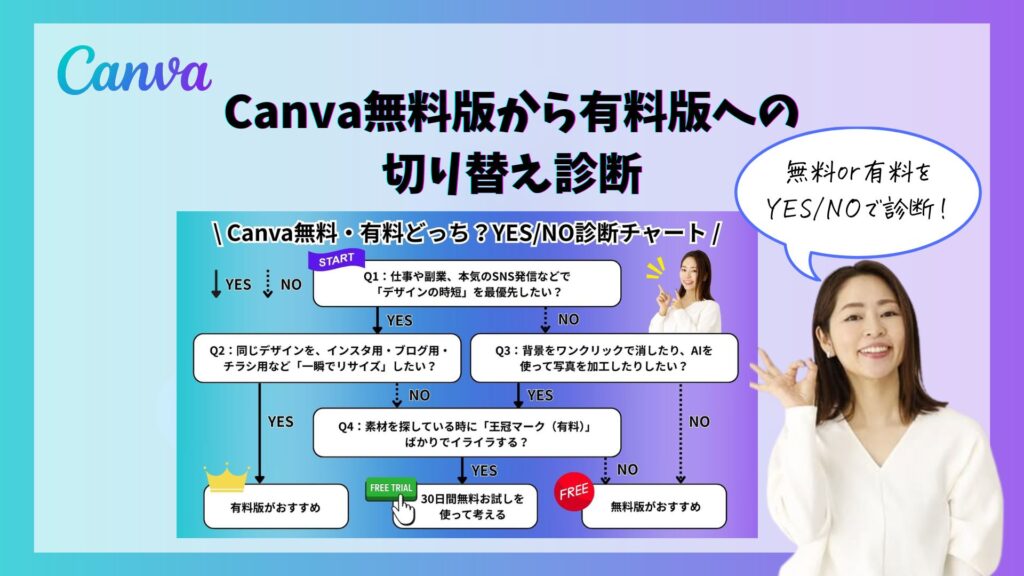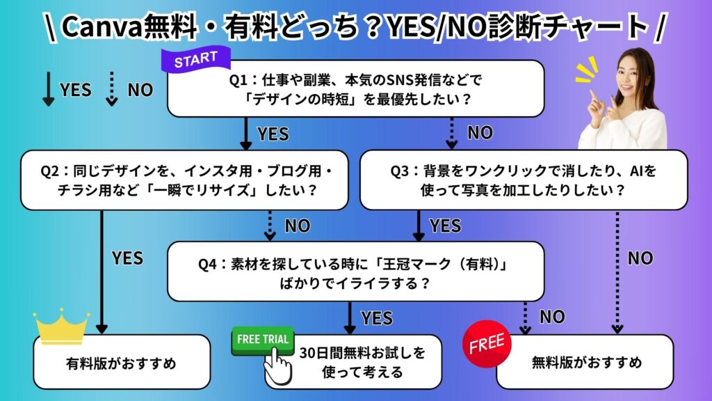 それでも、Canva無料版・有料版で迷っている方は、以下の『YES/NO診断チャート』をお試しください。