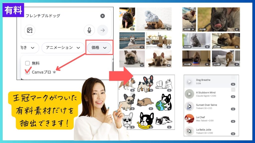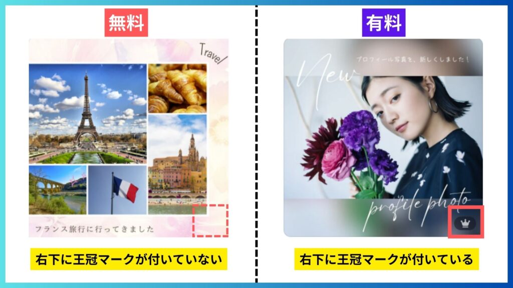 無料版では、使いたい魅力的な写真やイラストに「王冠マーク(有料)」がついていて、デザインを妥協したり別の素材を探し直したりする場面が少なくありません。