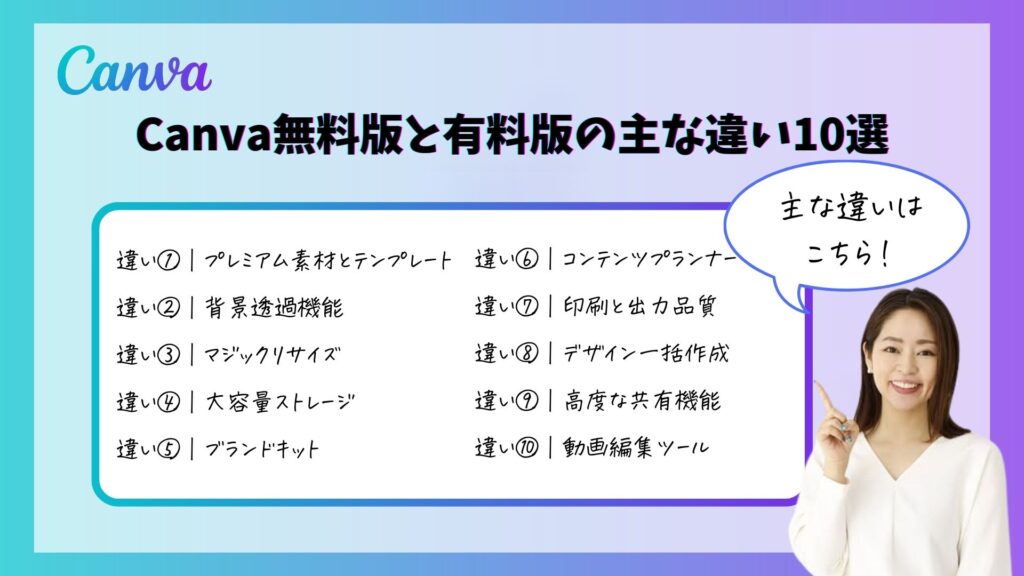 ここではCanva無料版・有料版の主な違いを10個ピックアップして解説します。