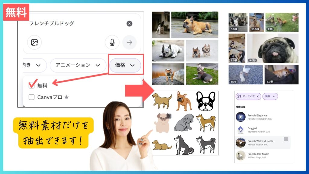 無料版は、 約470万点の写真・画像素材、イラスト、フォント、動画、音声と、160万点以上のテンプレートが利用可能です。