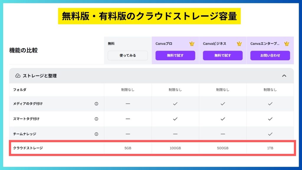 2025年8月の改定で無料版は5GBのままですが、有料版のストレージ容量はCanvaPro(1GB)、ビジネス(500GB)、エンタープライズ(1TB)となっています。