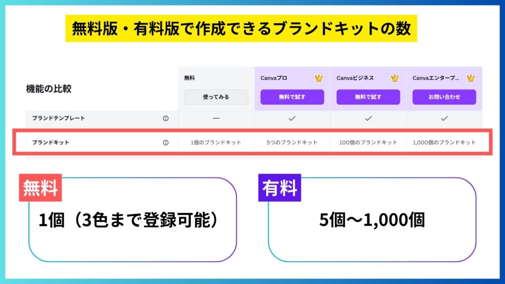 Canvaの無料版・有料版では、デザインの統一感を維持するための「ブランドキット」の登録数に違いがあります。