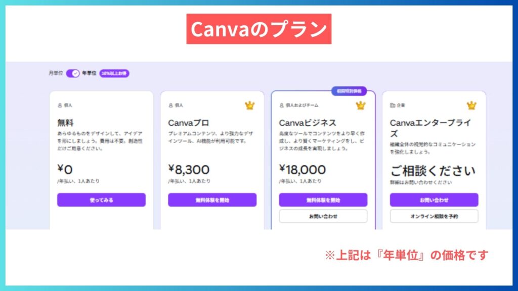Canvaには無料版と有料版(Canvaプロ/Canvaビジネス/Canvaエンタープライズ)のプラン設定があります。
