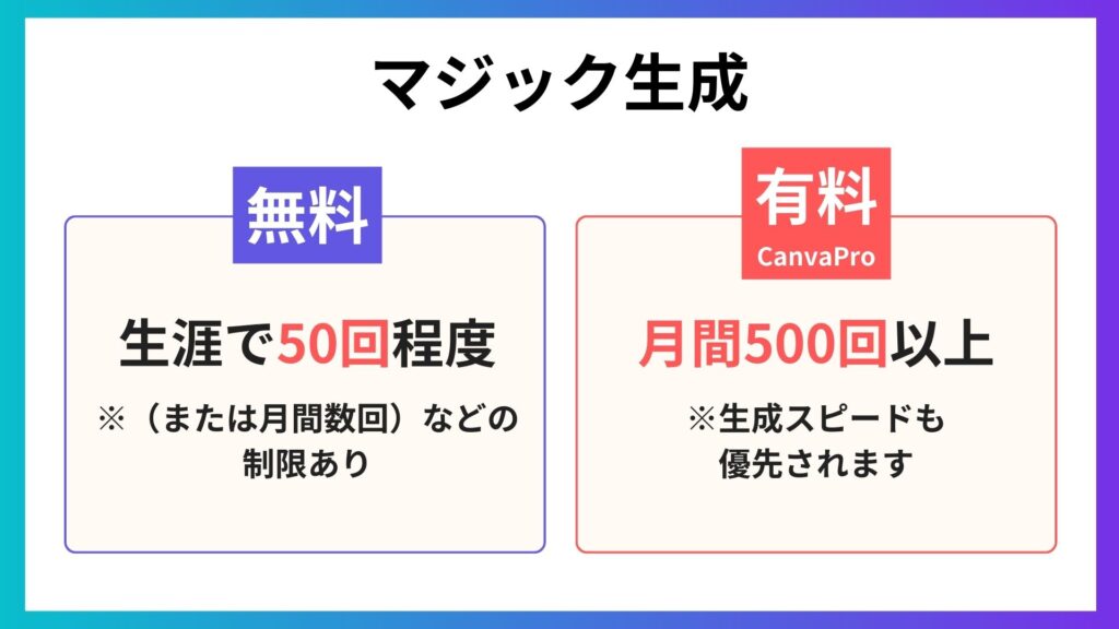 2026年現在の仕様では、無料版でもAIによる画像生成(マジック生成)などを体験できますが、利用回数には厳しい制限があります。