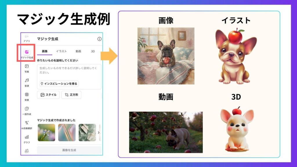 被写体を綺麗に切り抜く「背景透過」や、写真に写り込んだ不要なものを消す「マジック消しゴム」、作成したデザインをInstagram用や資料用など複数のサイズへ一瞬で自動変換する「マジックリサイズ(一括サイズ変更)」などがフル活用できます。