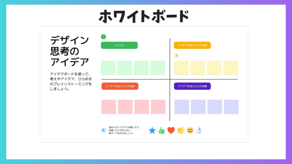 Canvaのホワイトボードは、アイデア出しや企画整理を、みんなで同時に書き込めるオンラインボードです。付せん感覚で使えて、会議やブレストに便利です。