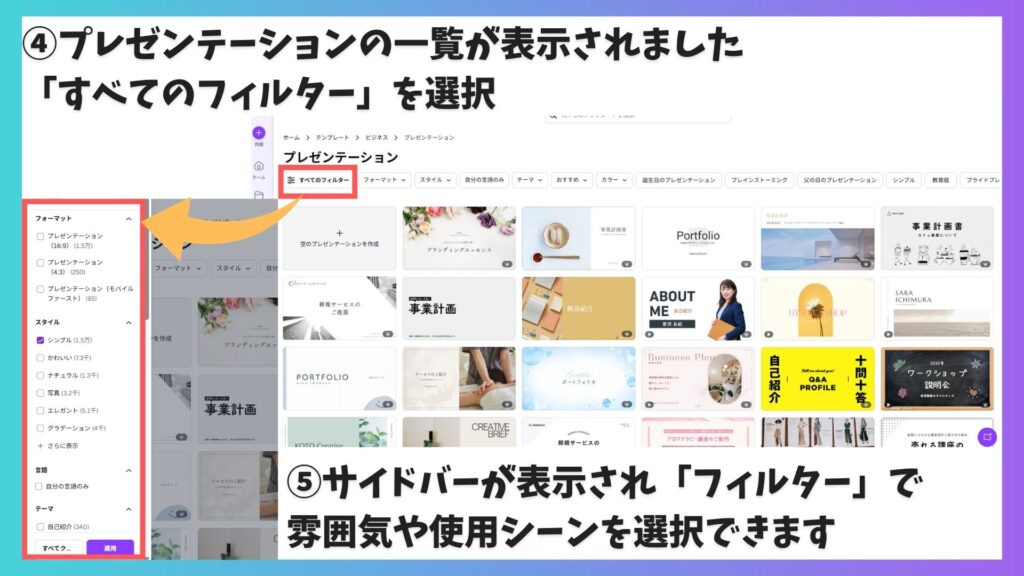 プレゼンテーションを選び、「すべてのフィルター」を開いてテーマを選ぶと、目的に合うテンプレートに絞り込みやすくなります。