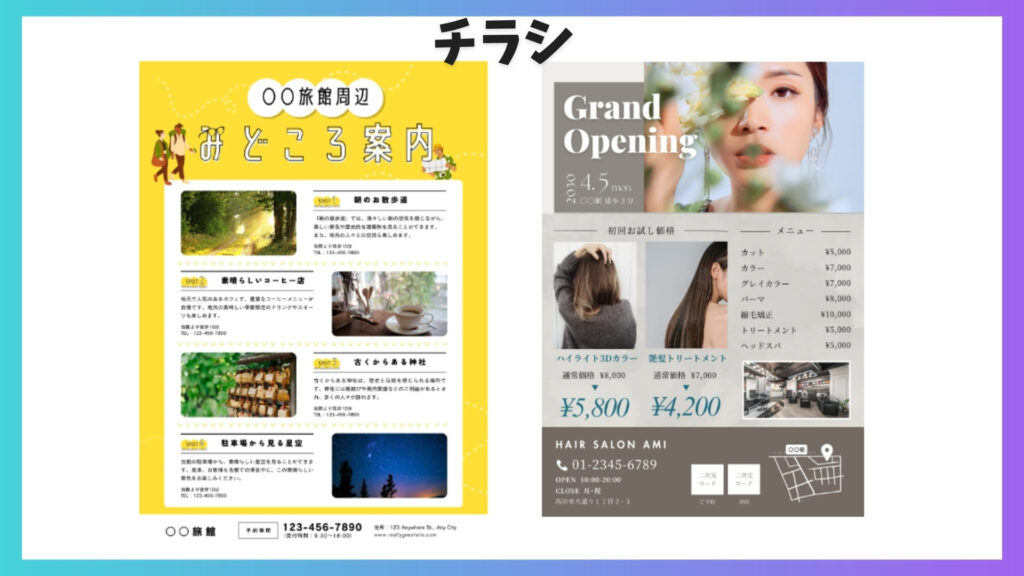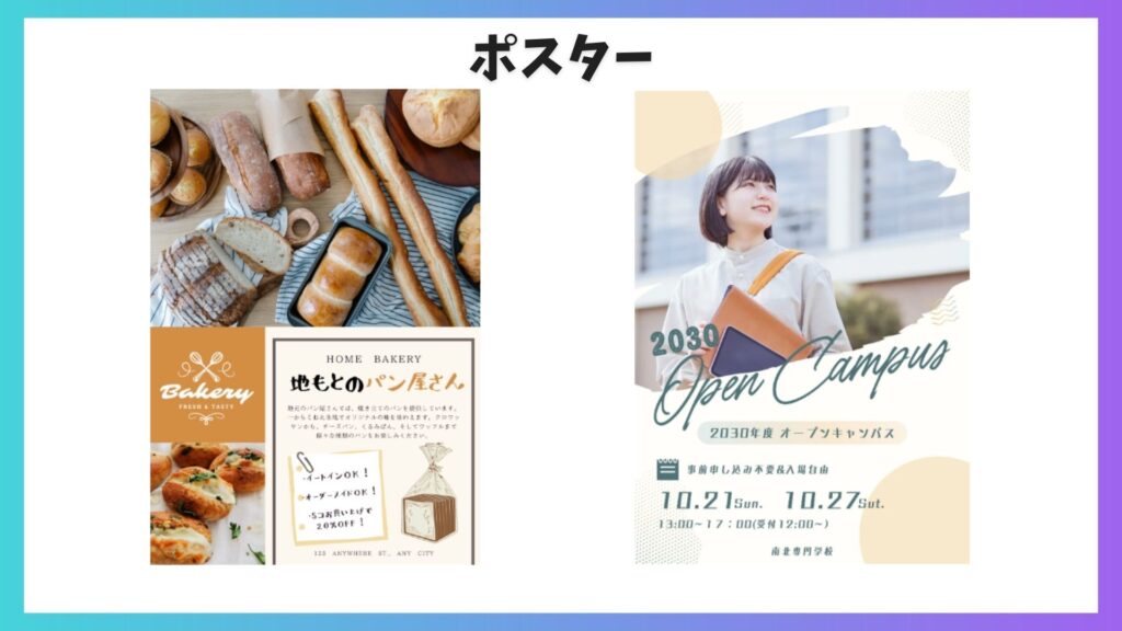チラシやポスターも、Canvaなら無料のテンプレートで簡単に作れます。