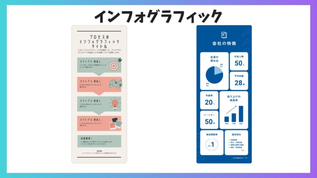 数字やデータを、ひと目で伝わる図や表に変換できます。