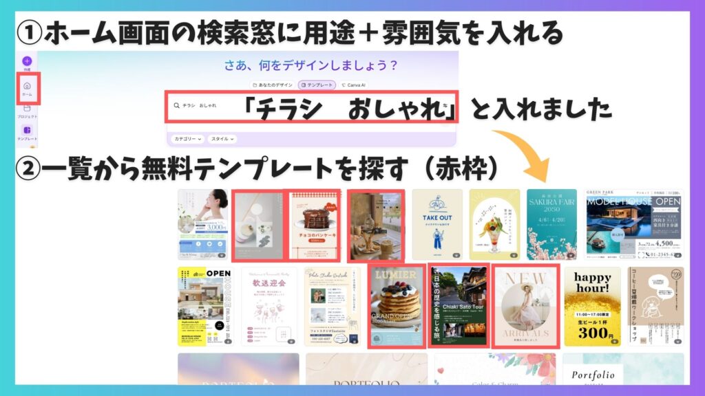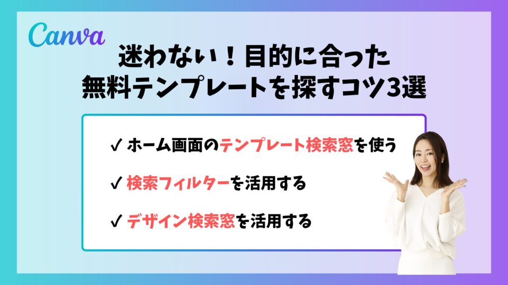 Canvaのテンプレートの探し方は複数ありますが、今回は長年Canvaを愛用している私がおすすめする「探し方のコツ3選」をご紹介します。