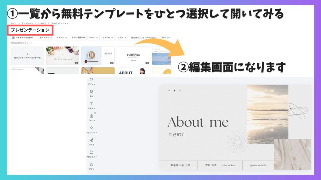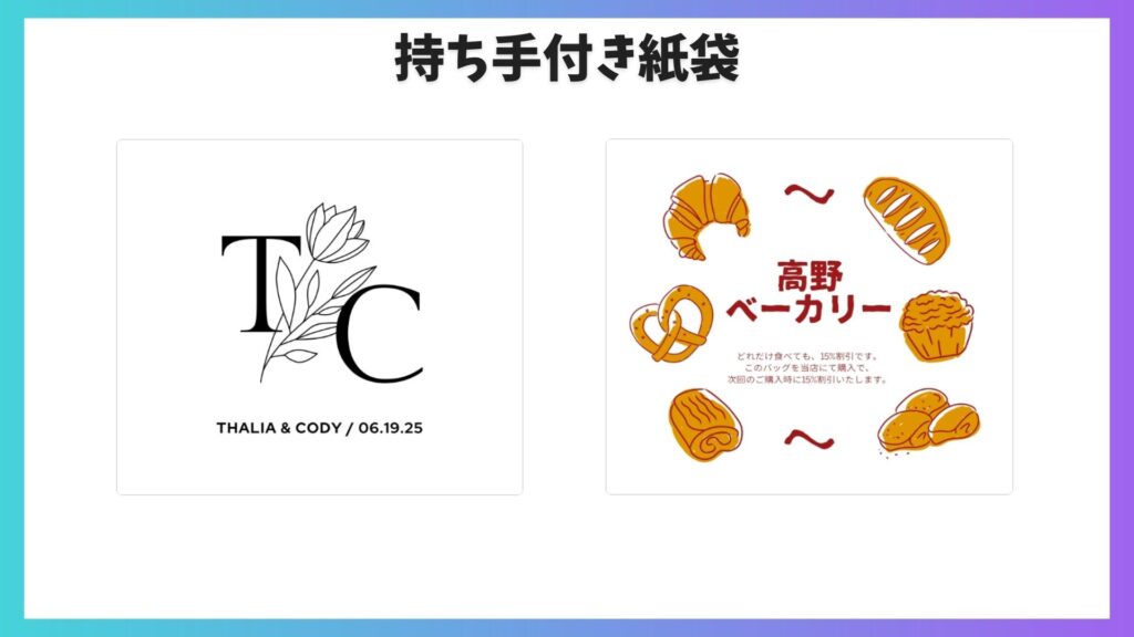 たとえば、「プレゼンテーション」「チラシ」「名刺」「Instagram」など、自分の作りたい用途をそのまま入力しましょう。