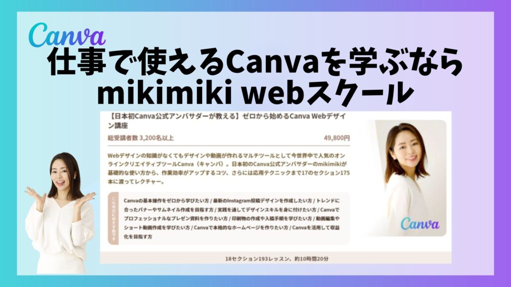 mikimiki webスクールで大人気のおすすめ講座『ゼロから学べるCanva Webデザイン完全講座』では、今回ご紹介したCanvaについてのレッスン動画をご用意しています。