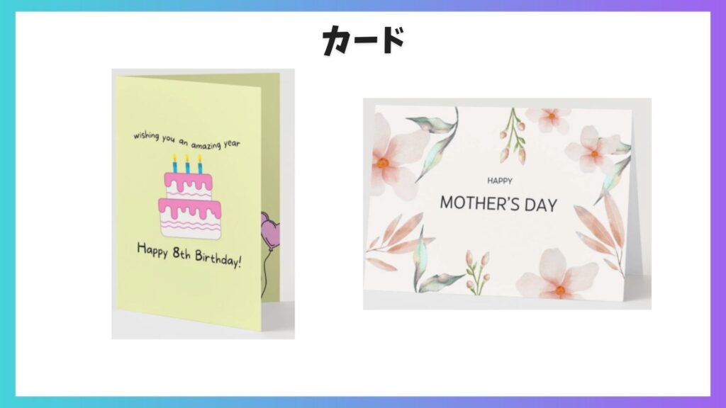 雰囲気もシンプルなものから、かわいいもの、高級感のあるものまで選択できる幅が広い点が魅力的です。名刺の他、ショップカード、サンキューカード、案内カードなど多くのテンプレートがあります。
