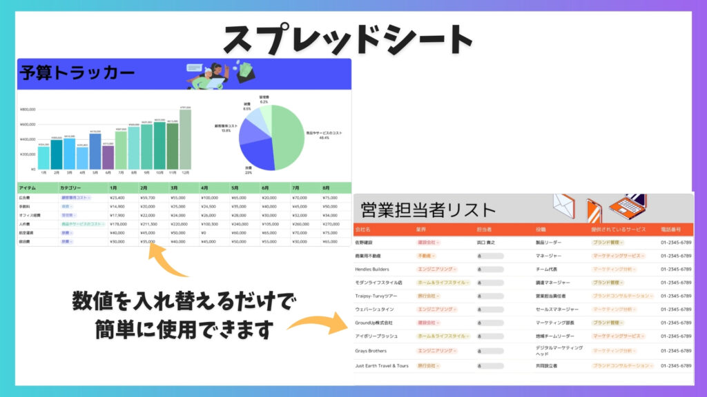 表やデータを整理・管理できるシートを作成できます。Canvaのスプレッドシートなら、テンプレートを選び数値を入れ替えるだけで見やすいデザインになり、共有もスムーズです。