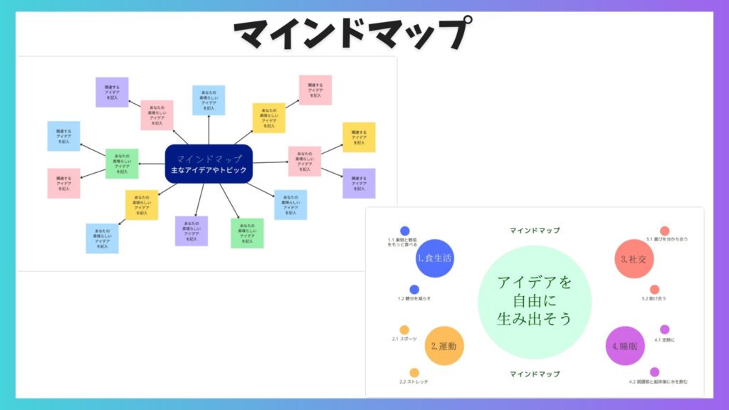 考えやアイデアを中心から広げて、頭の中を整理するときに便利です。