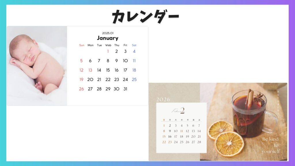 Canvaでカレンダーを作成することが可能です。壁掛けタイプや卓上タイプなど種類も選べます。