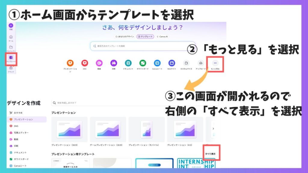 たとえばプレゼンテーションを作りたい場合、ホーム画面からテンプレートへ進み、一覧画面で「もっと見る」やカテゴリ選択を進めると、左側にサイドバーが出てきます。