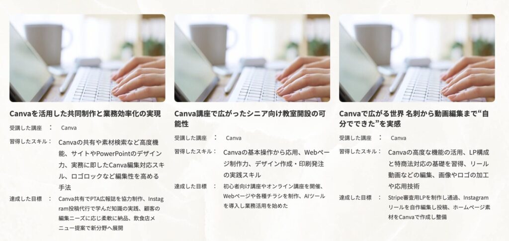 こうした“デザインの考え方”まで学べることで、テンプレートを選ぶだけの作業から、「意図を持って作れるデザイン」へと変わっていきます。