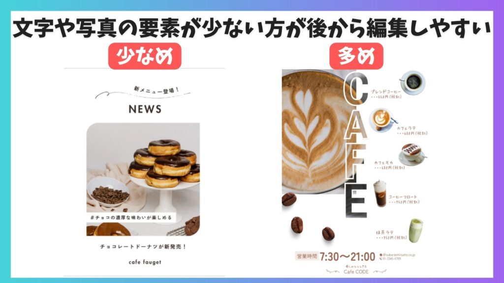 | デザイン編集 | 文字・色・配置の編集が可能 | 文字・色・配置の編集が可能 +選択肢が広がる |
