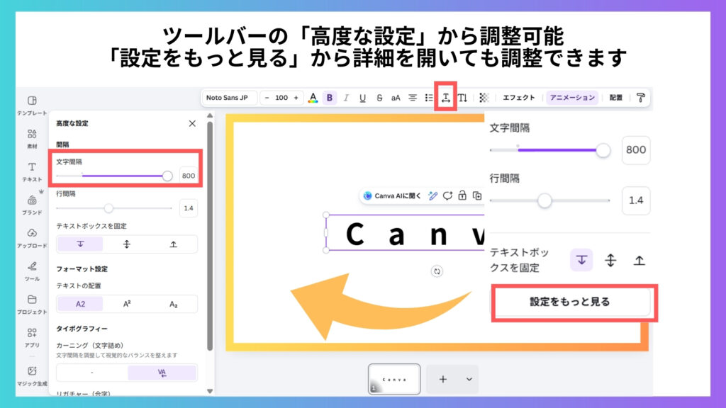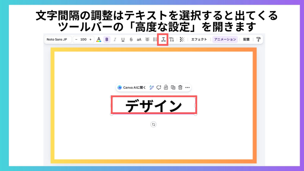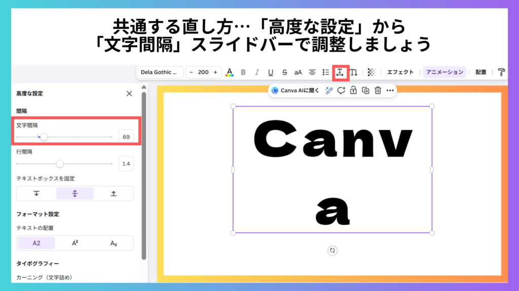Canvaの編集機能では、文字間隔の調整方法が2種類用意されています。