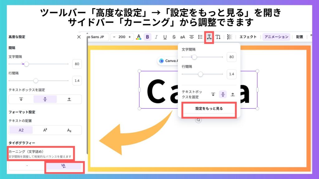 「設定をもっと見る」からサイドバーを表示させ、「カーニング(文字詰め)」の右側をクリックすると、特定の文字同士が個別に調整されます。