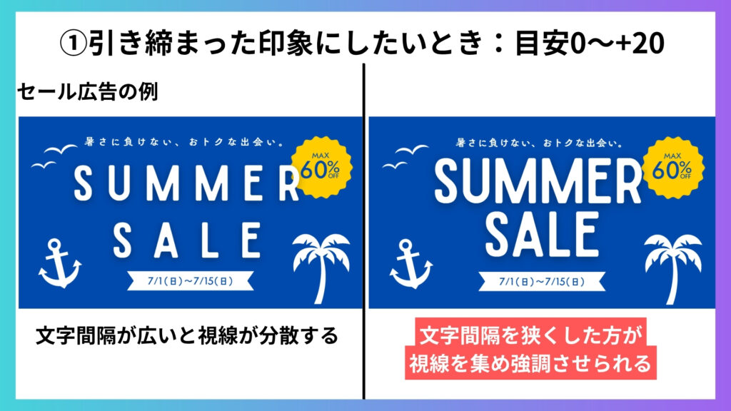 文字間隔を0〜+20程度にすると、文字が詰まりすぎず、適度に引き締まった印象になります。