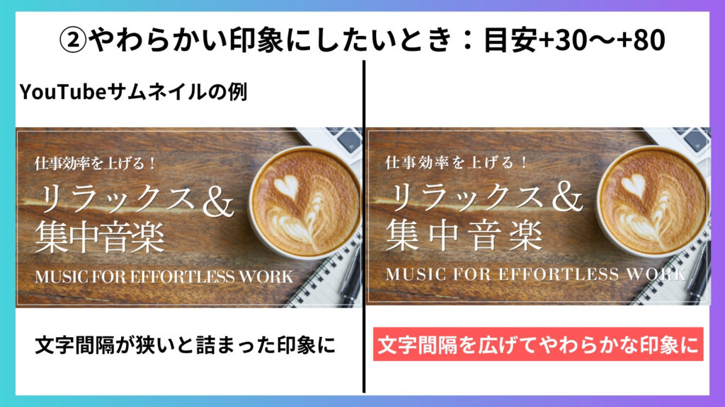 文字間隔を+30〜+80程度に設定すると、読みやすさとデザイン性のバランスを取りやすくなります。