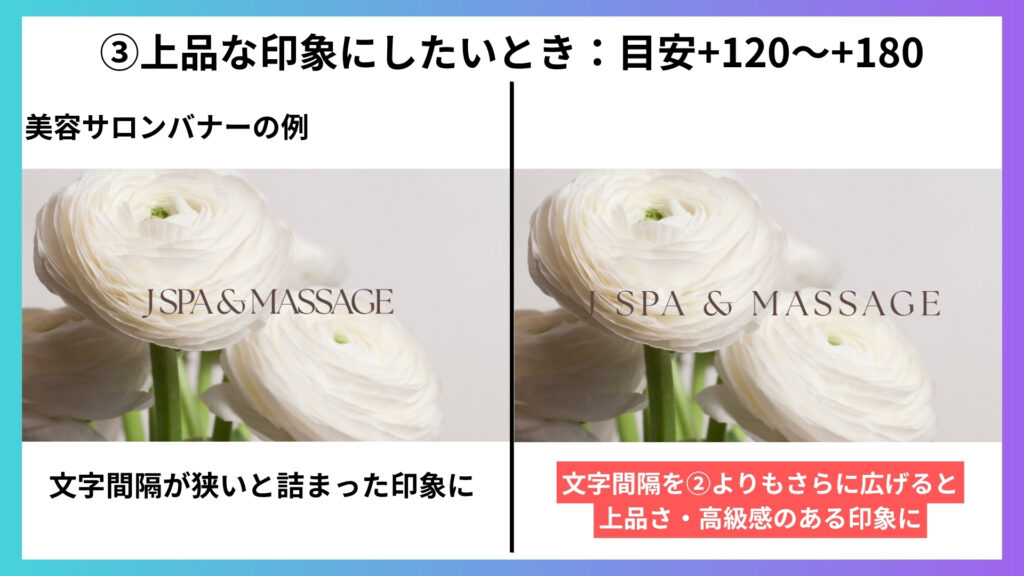 文字間隔を先ほどの②より広めに設定すると、落ち着いた上品な印象になります。