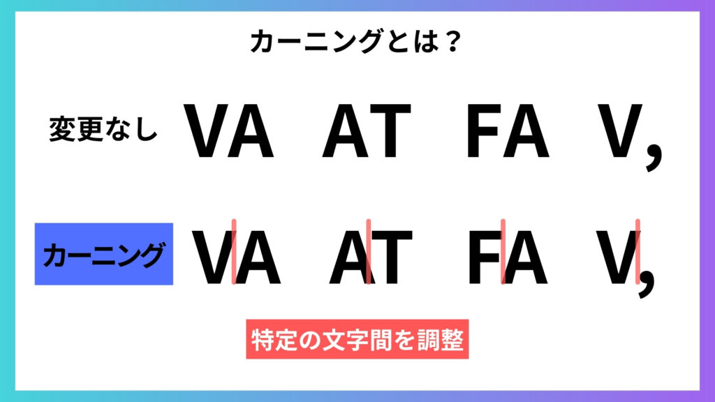 カーニング(kerning)とは、特定の文字ペアごとの間隔を“個別に”調整することです。