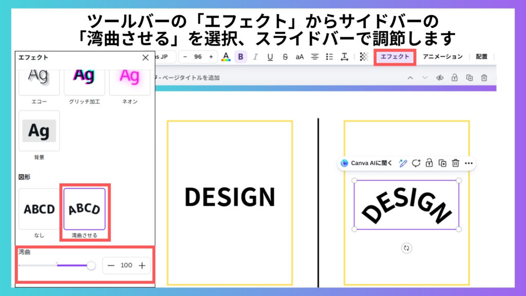 Canvaでは、文字をアーチ(カーブ)上に表示することも簡単にできます。